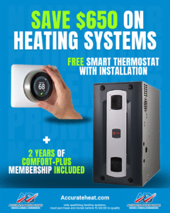 You can save on heat right now at Accurate Baker Elman. Get $650 off a qualifying heating system. You also get a FREE smart thermostat